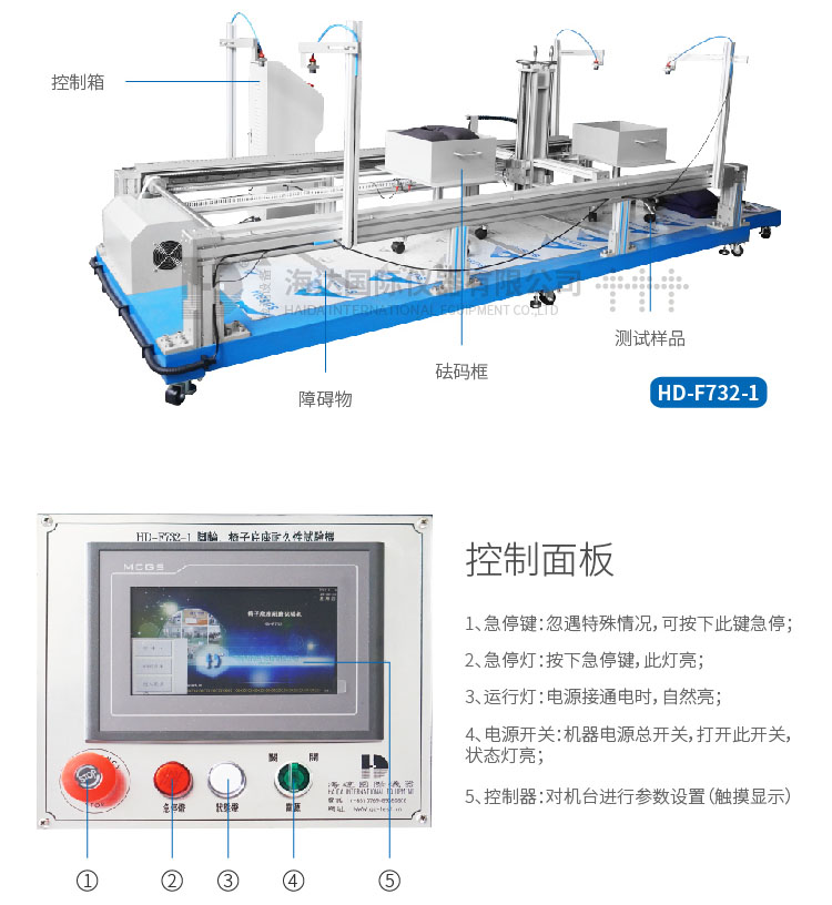 1、腳輪往複磨損試驗: 1)速率(可調):8-12次/min(輕工(gōng)、Bifma)、6次/min(En要(yào)求) 2)測試次數:2000次通過障礙塊、98000次拆除障礙塊(輕工、Bifma) 3)障礙塊:3塊鋼板 4)加載物(wù): a) Bifma標準(zhǔn):113Kg(249lb); b) QB/T標準:102Kg(225lb); c) EN標準:110KG(243lb) 5)測試行程:≥762MM(30in) 2、滾動、滑動阻力測試儀 1)速率(可調(diào)):50±5mm/S 2) 測試行程:≥550MM 3)施力部位:離地麵200±5mm處 3、控製模式:PLC 和觸摸屏操作 1.加載砝碼 :122KG(一套) 2.測試速(sù)度:10±2 次(cì)/min 3.顯(xiǎn)示方式(shì) :觸摸屏顯示 4.控(kòng)製方式 :PLC控(kòng)製 5.測試次數:1-999999次(任意設定) 6.電源:AC /220V、3A、50HZ 7.整機功(gōng)率:0.2KW 8.氣壓:≥6kg/cm² 機台尺寸:LxWxH=3000x1000x1500 mm <主要配件>: 1.砝碼盤13kg:1個 2.椅腳障礙塊:1套(3個短(duǎn)2個長) 3.限位夾(jiá)具(jù):2個 4.插(chā)銷杆:2個 5.轉動夾具(jù):一個 6.鋼珠袋(dài):10kg x 10袋,5kg x 1袋,1kg x 5袋 | ||
