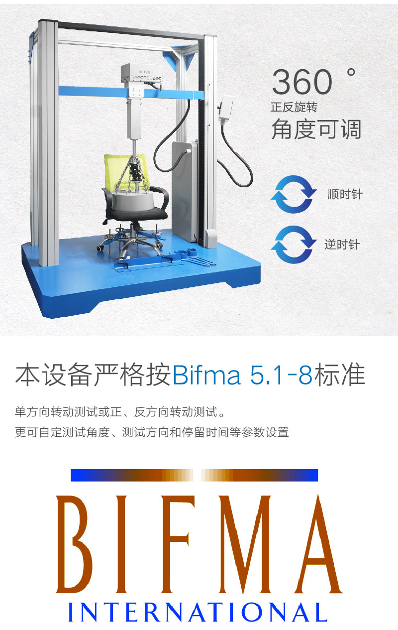 辦公椅旋轉(zhuǎn)壽(shòu)命(mìng)試驗機適用於椅麵具有旋轉功能的(de)辦公椅,用於評估辦公椅子抵受重複(fù)旋轉(zhuǎn)的壓力及磨損 1、 可設定正轉和反轉角度(45°到355°) 2、 單向360°旋轉。 | ||