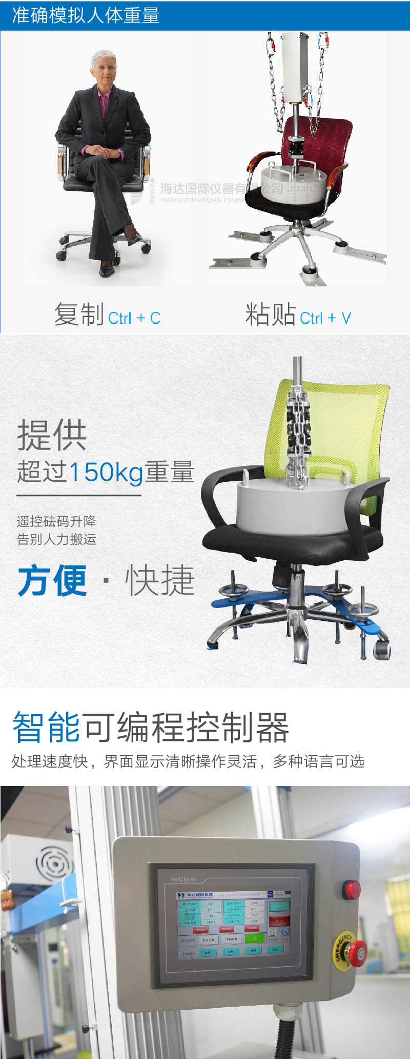 1、本設備除可按Bifma 5.1標準進行。單方向或雙向(xiàng)轉動測試或按EN1335標準正(zhèng)、反方向轉動測試, 2、更可(kě)自定測試角度、測試方向和停留時間等參數設置 3、本機旋轉台麵直徑為800毫米,座椅尺寸寬度0-1000 mm 4、旋轉速度5~20周/分鍾(zhōng),可以自行設定 5、控製模式: 可(kě)編程控製器(PLC),配搭(dā)大(dà)型液晶顯(xiǎn)示屏 6、次數設定:0~999,999次(cì) 7、配件:113公斤重(chóng)砝碼和電動起重(chóng)裝置,方便提升(shēng)重(chóng)物 8、電壓: 單相,AC220V,功率:1KW; 1.加載砝碼 :113KG(一個) 2.測試速度:10±5 r/min 3.顯示方式 :觸摸屏顯示 4.控(kòng)製方式 :PLC控製 5.測試次數:1-999999次(任意設定) 6.電源:AC /220V、3A、50HZ 7.整機功率:1.5KW 8.機(jī)台(tái)尺寸:LxWxH=1850x1200x2450 mm 9.整(zhěng)機帶異常報警功 <主(zhǔ)要配件>: 1.椅腳擋塊:1個 2.椅腳壓塊:1套(帶4個鑄鐵手輪)