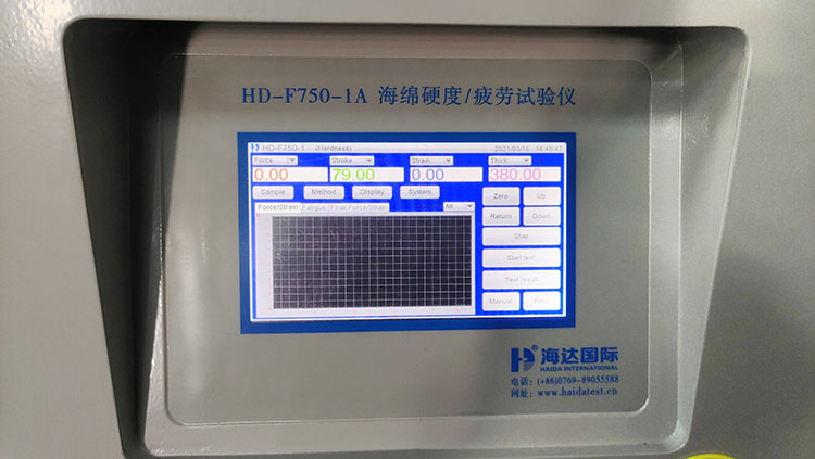 壓陷硬度測試:將方形試樣放入到測試儀的下(xià)平台上,上(shàng)壓盤以規定速度向下壓縮一定的尺寸,按標準要(yào)求的(de)A法(B法、C法)進行測試,荷重元將感(gǎn)應到的壓力反饋給電腦處理(lǐ),通過電腦測試界麵查看(kàn)數據結果,從而測得海綿、泡沫等試樣等材料(liào)的壓陷硬度。