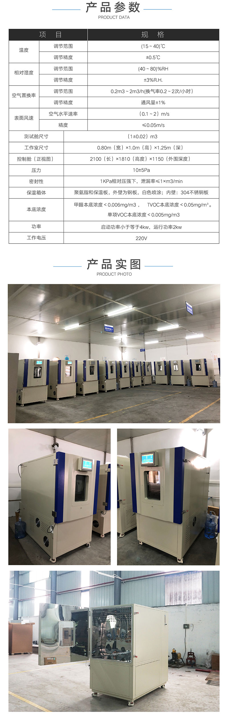 1.箱內容積:(1.0±0.02)m³; 2.測試艙箱內(nèi)溫度可調範(fàn)圍:(10—40)℃,精度:±0.5℃,分辨率0.1℃,連續可調; 3.箱內相對濕度可調範圍:(30—80)%,精度(dù):±3%,分辨率0.1%,連續可調; 4.箱內空(kōng)氣流速(sù):(0.1—2)m/s,精度(dù):±0.05 m/s,連續可調; 5.空氣置換率:(0.2—2)m³/h,精度:±5%,連續可調; 6.密封性:當(dāng)有1000Pa的過壓時,氣體(tǐ)泄漏少於10-3×1m³/min,進出口(kǒu)氣體流(liú)量差小於1%; 7.測試艙內本底濃度:甲醛≤0.006mg/m³; 8.絕熱性:氣候箱壁及門應(yīng)具有有效的熱絕緣; 9.噪音:氣候箱(xiāng)工作(zuò)時的噪聲值不大於60dB; 10.連續工作時間:氣候箱連續工作時間不小於40 天; 11.監(jiān)測參數:監測顯示艙內的溫濕度(dù)、送排風量、開關機時間(jiān)、工作時間,數據可轉移(yí)存儲; 12.控濕方法:采用露點控濕法,來控製工作艙相對濕度,濕度穩(wěn)定,波動幅度<3%.rh.並且不會在艙(cāng)壁產生(shēng)水(shuǐ)珠; 13.外形尺寸:1630 x 1200 x 1806mm (長x寬x高); 配置清單 1.標配:主機一台,抽樣管、吸收瓶、氣體采樣器(qì); 2.選配(pèi):分光光度計,水浴鍋,藥劑,玻璃儀器,標準溶液,天平; | ||