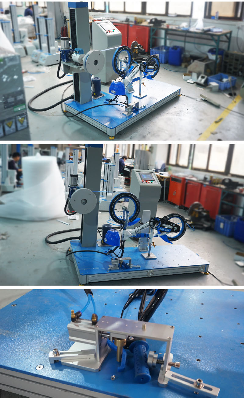 該設備(bèi)用於測試手閘製動力,於驅動輪上纏(chán)繞一(yī)圈半帶子,在被測閘把末端25mm處施加一50~90N力(lì),拉轉(zhuǎn)帶子轉動一圈半,當車輪的線速度達到0.5m/s至2m/s時,再拉轉一圈,記錄其平均製動(dòng)力。對閘把取五個不同的力,每個力測試三個不同的(de)讀數,取平(píng)均值。 設計(jì)標準:GB14616 |