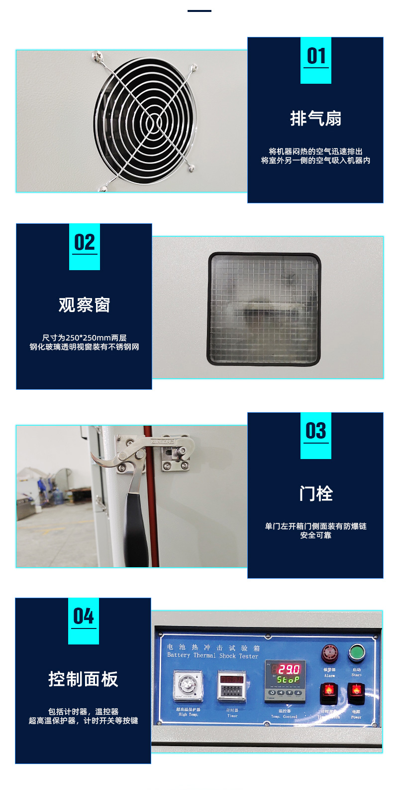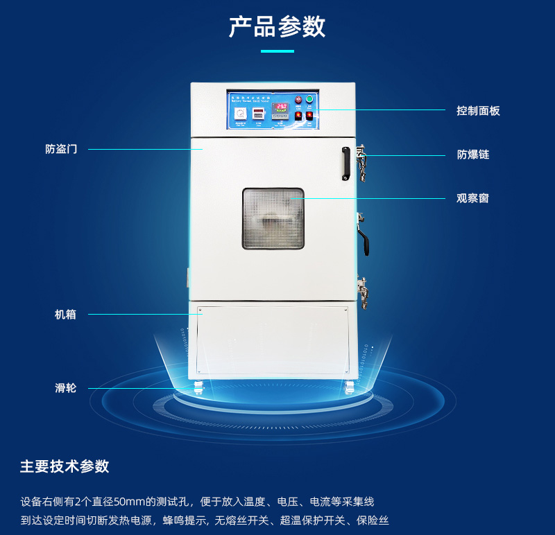 1、內箱尺寸:400x400x450mm(寬x深x高) 2、外箱尺寸:650x550x1100mm(寬x深x高) 3、溫度範圍:常溫~200℃ 5、溫度顯示精度:0.1℃ 6、溫度穩定度:±1.0℃ 7、溫度均勻度:±2℃ 8、升溫時間:(5±2)℃/min,(平均升溫,非線性(xìng)空載) 9、溫(wēn)控表:可編程(chéng)溫度控製器,可實現升溫總時(shí)間控(kòng)製,不同於普通溫控表。 儀器結構(gòu): 10、內箱(xiāng)材質(zhì):不鏽(xiù)鋼板 11、外箱材質:冷軋鋼板(bǎn)烤漆 12、保溫材質:壓縮玻璃棉 13、保溫裝置:無熔絲開(kāi)關、超溫保(bǎo)護開關、保險絲 14、使用電源:1∮,220V,20A 15、安全裝置:次超溫報警,MCCB過載保護等 16、排氣煙道:葉片式設(shè)計可調出風量 17、控製形成(chéng):電池熱衝擊試驗箱溫度到達設定溫度後自動打開時間計(jì),時間到達後切斷發熱電源(yuán),蜂鳴提示 18、送風(fēng)循環係:對流(liú)式送(sòng)風循環係統 19、控製係統:溫到計(jì)時,時到停機、蜂鳴提示。 | ||