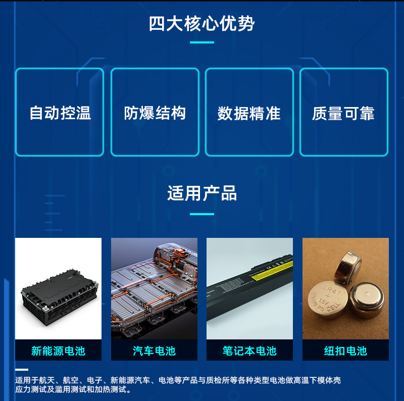 電池熱衝擊試驗箱是模擬電池放置在自(zì)然對流或(huò)強製通風的高溫箱中,以(yǐ)一定的升溫速率升溫至設定測試(shì)溫度並保持一(yī)定時間,采(cǎi)用熱風循(xún)環係統,可保證工作溫度分布均勻。 適用標準: GB/T 31485-2015,GB/T 31241-2014,UN38.3,IEC62133,QC/T743-201X,GB/T 8897.4-2008,GB/T 21966-2008 | ||