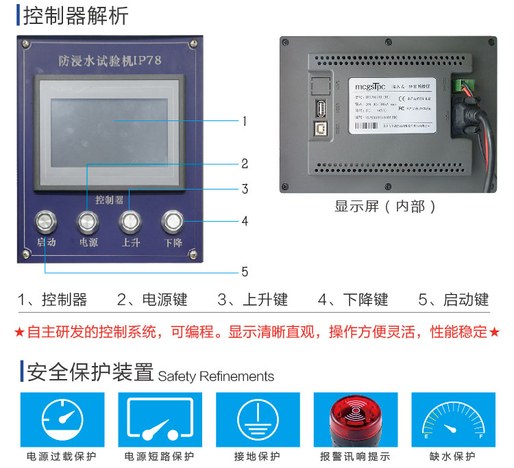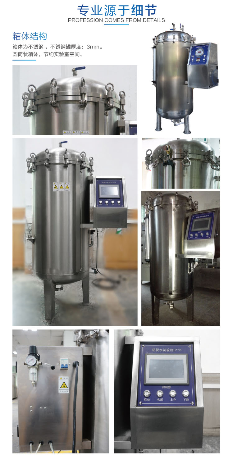 型號HD-E710-4模擬水壓50m20m內箱(xiāng)尺寸(W*D*H)直徑600*高1000mm直徑400*高600mm外箱尺寸(W*D*H)直徑820*高1500mm直徑(jìng)600*高1100mm箱(xiāng)體材質304不(bú)鏽鋼,厚度3mm水壓(yā)常壓-0.5MPa常壓-0.2MPa測(cè)試周期0 ~ 99分, 99秒試樣提升裝置手提式不鏽鋼吊籃(lán)水位顯示刻度加水位管不鏽鋼罐厚度6mm3mm控製器PLC觸(chù)摸屏控製(zhì)器保護裝置帶壓力保護防暴裝置和排水卸壓(yā)裝置電源三相,AC380V, 50/60HZ | ||