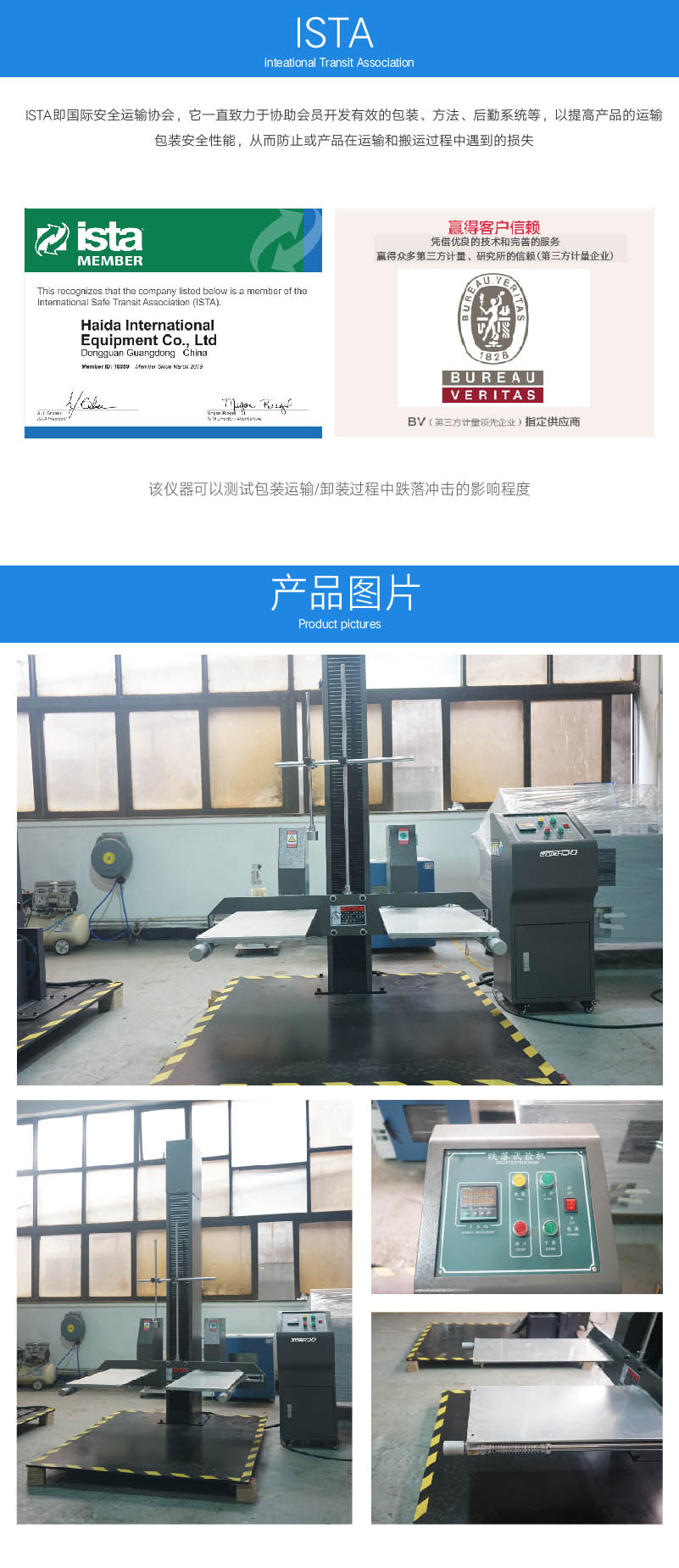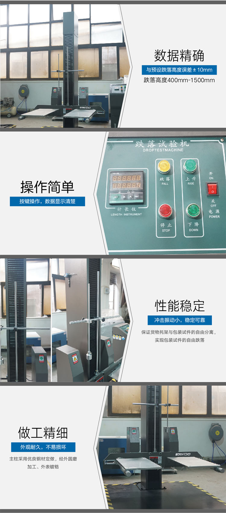 跌(diē)落(luò)試驗機用於測試產品包裝受到墜落之受(shòu)損(sǔn)情況,及評估運輸搬運過程時耐衝擊強(qiáng)度。采用雙柱導向、 高度(dù)跌落(luò)次數可(kě)置,工作穩定(dìng)可靠,可(kě)實現棱、麵、角跌落,滿足GB/T4857.5-92、ISO2248-1972E。采用(yòng)光 電控製,可設定七檔跌落高度,也可自由選擇跌落(luò)高度,跌落釋放采用電磁控製,能使試樣瞬間自由落下, 對(duì)包(bāo)裝容器進行之棱、角、平麵進行跌落衝擊試驗。 設(shè)計標準:ISO 2248,JIS Z0202-87,GB/T4857.5-92 | ||